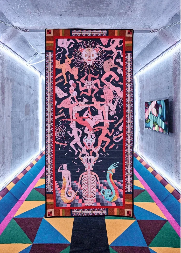 Jess Johnson’s recent textile works Necrotic Scroll (2024), Tower of Babel (2024), and We Can’t Keep Going the Way We’ve Been Going but We Know No Other Way to Go (2024) mark a fascinating turn in her practice. Known for her complex worlds built through drawing and virtual reality, Johnson has translated that language into quilts and fabric banners, pulling her speculative cosmologies into the realm of touch.